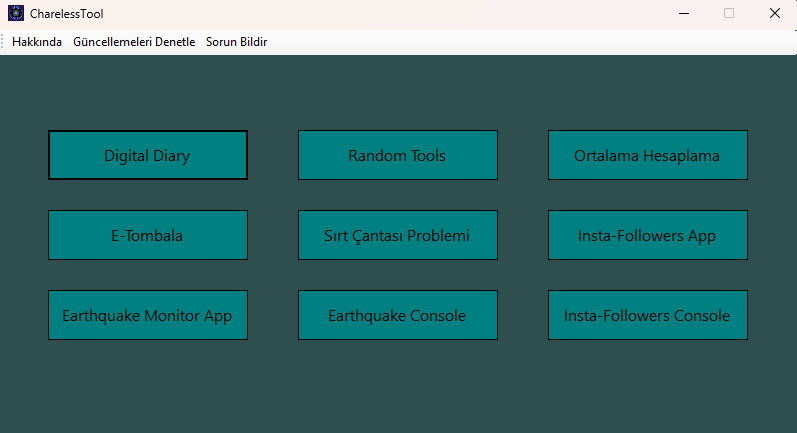 Açıklama : Chareless Tool programı; geliştirmiş olduğum Dijital Günlük, Rastgele Araçlar, Ortalama Hesaplama, E-Tombala, Sırt Çantası Problemi Yazılımı, Insta-Followers, Earthquake Monitor uygulamalarının tek bir uygulama üzerinden çalıştırılmasını sağlamaktadır.